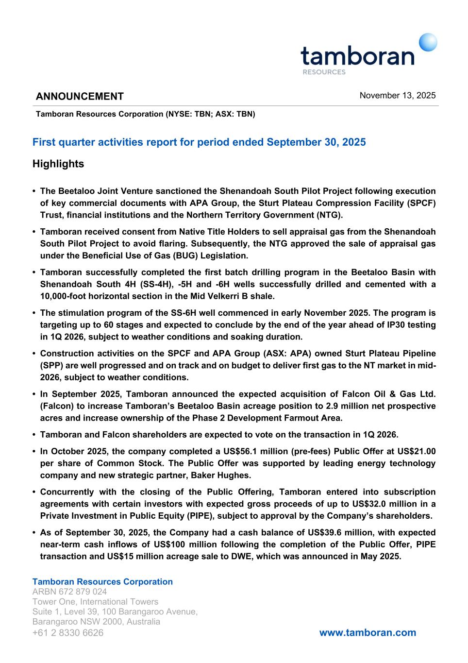 Tamboran Resources Corporation ARBN 672 879 024 Tower One, International Towers Suite 1, Level 39, 100 Barangaroo Avenue, Barangaroo NSW 2000, Australia +61 2 8330 6626 www.tamboran.com First quarter activities report for period ended September 30, 2025 Highlights • The Beetaloo Joint Venture sanctioned the Shenandoah South Pilot Project following execution of key commercial documents with APA Group, the Sturt Plateau Compression Facility (SPCF) Trust, financial institutions and the Northern Territory Government (NTG). • Tamboran received consent from Native Title Holders to sell appraisal gas from the Shenandoah South Pilot Project to avoid flaring. Subsequently, the NTG approved the sale of appraisal gas under the Beneficial Use of Gas (BUG) Legislation. • Tamboran successfully completed the first batch drilling program in the Beetaloo Basin with Shenandoah South 4H (SS-4H), -5H and -6H wells successfully drilled and cemented with a 10,000-foot horizontal section in the Mid Velkerri B shale. • The stimulation program of the SS-6H well commenced in early November 2025. The program is targeting up to 60 stages and expected to conclude by the end of the year ahead of IP30 testing in 1Q 2026, subject to weather conditions and soaking duration. • Construction activities on the SPCF and APA Group (ASX: APA) owned Sturt Plateau Pipeline (SPP) are well progressed and on track and on budget to deliver first gas to the NT market in mid- 2026, subject to weather conditions. • In September 2025, Tamboran announced the expected acquisition of Falcon Oil & Gas Ltd. (Falcon) to increase Tamboran’s Beetaloo Basin acreage position to 2.9 million net prospective acres and increase ownership of the Phase 2 Development Farmout Area. • Tamboran and Falcon shareholders are expected to vote on the transaction in 1Q 2026. • In October 2025, the company completed a US$56.1 million (pre-fees) Public Offer at US$21.00 per share of Common Stock. The Public Offer was supported by leading energy technology company and new strategic partner, Baker Hughes. • Concurrently with the closing of the Public Offering, Tamboran entered into subscription agreements with certain investors with expected gross proceeds of up to US$32.0 million in a Private Investment in Public Equity (PIPE), subject to approval by the Company’s shareholders. • As of September 30, 2025, the Company had a cash balance of US$39.6 million, with expected near-term cash inflows of US$100 million following the completion of the Public Offer, PIPE transaction and US$15 million acreage sale to DWE, which was announced in May 2025. ANNOUNCEMENT November 13, 2025 Tamboran Resources Corporation (NYSE: TBN; ASX: TBN)