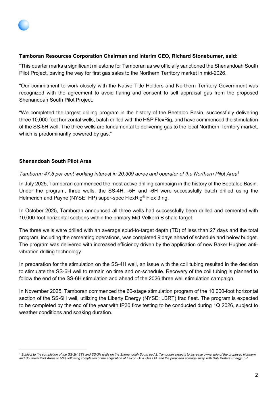 2 Tamboran Resources Corporation Chairman and Interim CEO, Richard Stoneburner, said: “This quarter marks a significant milestone for Tamboran as we officially sanctioned the Shenandoah South Pilot Project, paving the way for first gas sales to the Northern Territory market in mid-2026. “Our commitment to work closely with the Native Title Holders and Northern Territory Government was recognized with the agreement to avoid flaring and consent to sell appraisal gas from the proposed Shenandoah South Pilot Project. “We completed the largest drilling program in the history of the Beetaloo Basin, successfully delivering three 10,000-foot horizontal wells, batch drilled with the H&P FlexRig, and have commenced the stimulation of the SS-6H well. The three wells are fundamental to delivering gas to the local Northern Territory market, which is predominantly powered by gas.” Shenandoah South Pilot Area Tamboran 47.5 per cent working interest in 20,309 acres and operator of the Northern Pilot Area1 In July 2025, Tamboran commenced the most active drilling campaign in the history of the Beetaloo Basin. Under the program, three wells, the SS-4H, -5H and -6H were successfully batch drilled using the Helmerich and Payne (NYSE: HP) super-spec FlexRig® Flex 3 rig. In October 2025, Tamboran announced all three wells had successfully been drilled and cemented with 10,000-foot horizontal sections within the primary Mid Velkerri B shale target. The three wells were drilled with an average spud-to-target depth (TD) of less than 27 days and the total program, including the cementing operations, was completed 9 days ahead of schedule and below budget. The program was delivered with increased efficiency driven by the application of new Baker Hughes anti- vibration drilling technology. In preparation for the stimulation on the SS-4H well, an issue with the coil tubing resulted in the decision to stimulate the SS-6H well to remain on time and on-schedule. Recovery of the coil tubing is planned to follow the end of the SS-6H stimulation and ahead of the 2026 three well stimulation campaign. In November 2025, Tamboran commenced the 60-stage stimulation program of the 10,000-foot horizontal section of the SS-6H well, utilizing the Liberty Energy (NYSE: LBRT) frac fleet. The program is expected to be completed by the end of the year with IP30 flow testing to be conducted during 1Q 2026, subject to weather conditions and soaking duration. 1 Subject to the completion of the SS-2H ST1 and SS-3H wells on the Shenandoah South pad 2. Tamboran expects to increase ownership of the proposed Northern and Southern Pilot Areas to 50% following completion of the acquisition of Falcon Oil & Gas Ltd. and the proposed acreage swap with Daly Waters Energy, LP.