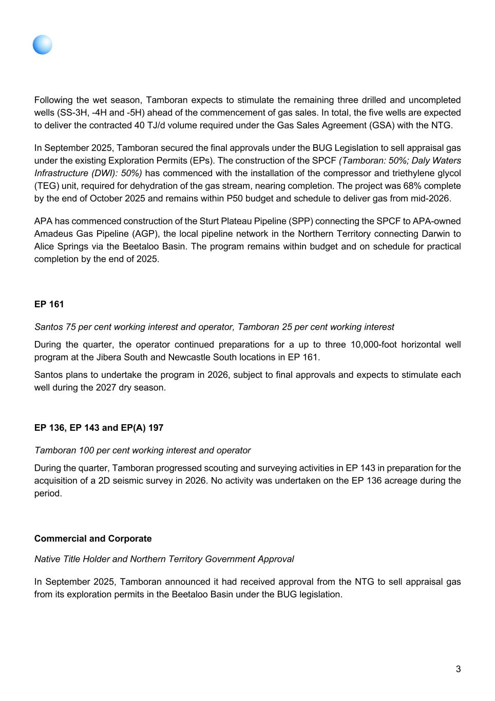 3 Following the wet season, Tamboran expects to stimulate the remaining three drilled and uncompleted wells (SS-3H, -4H and -5H) ahead of the commencement of gas sales. In total, the five wells are expected to deliver the contracted 40 TJ/d volume required under the Gas Sales Agreement (GSA) with the NTG. In September 2025, Tamboran secured the final approvals under the BUG Legislation to sell appraisal gas under the existing Exploration Permits (EPs). The construction of the SPCF (Tamboran: 50%; Daly Waters Infrastructure (DWI): 50%) has commenced with the installation of the compressor and triethylene glycol (TEG) unit, required for dehydration of the gas stream, nearing completion. The project was 68% complete by the end of October 2025 and remains within P50 budget and schedule to deliver gas from mid-2026. APA has commenced construction of the Sturt Plateau Pipeline (SPP) connecting the SPCF to APA-owned Amadeus Gas Pipeline (AGP), the local pipeline network in the Northern Territory connecting Darwin to Alice Springs via the Beetaloo Basin. The program remains within budget and on schedule for practical completion by the end of 2025. EP 161 Santos 75 per cent working interest and operator, Tamboran 25 per cent working interest During the quarter, the operator continued preparations for a up to three 10,000-foot horizontal well program at the Jibera South and Newcastle South locations in EP 161. Santos plans to undertake the program in 2026, subject to final approvals and expects to stimulate each well during the 2027 dry season. EP 136, EP 143 and EP(A) 197 Tamboran 100 per cent working interest and operator During the quarter, Tamboran progressed scouting and surveying activities in EP 143 in preparation for the acquisition of a 2D seismic survey in 2026. No activity was undertaken on the EP 136 acreage during the period. Commercial and Corporate Native Title Holder and Northern Territory Government Approval In September 2025, Tamboran announced it had received approval from the NTG to sell appraisal gas from its exploration permits in the Beetaloo Basin under the BUG legislation.