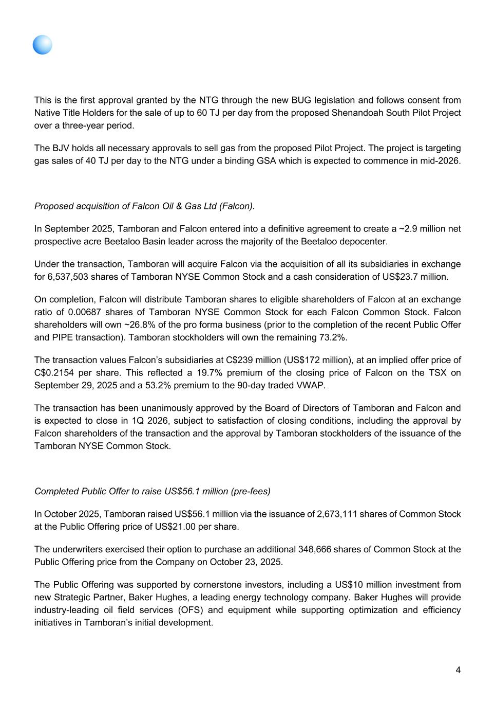4 This is the first approval granted by the NTG through the new BUG legislation and follows consent from Native Title Holders for the sale of up to 60 TJ per day from the proposed Shenandoah South Pilot Project over a three-year period. The BJV holds all necessary approvals to sell gas from the proposed Pilot Project. The project is targeting gas sales of 40 TJ per day to the NTG under a binding GSA which is expected to commence in mid-2026. Proposed acquisition of Falcon Oil & Gas Ltd (Falcon). In September 2025, Tamboran and Falcon entered into a definitive agreement to create a ~2.9 million net prospective acre Beetaloo Basin leader across the majority of the Beetaloo depocenter. Under the transaction, Tamboran will acquire Falcon via the acquisition of all its subsidiaries in exchange for 6,537,503 shares of Tamboran NYSE Common Stock and a cash consideration of US$23.7 million. On completion, Falcon will distribute Tamboran shares to eligible shareholders of Falcon at an exchange ratio of 0.00687 shares of Tamboran NYSE Common Stock for each Falcon Common Stock. Falcon shareholders will own ~26.8% of the pro forma business (prior to the completion of the recent Public Offer and PIPE transaction). Tamboran stockholders will own the remaining 73.2%. The transaction values Falcon’s subsidiaries at C$239 million (US$172 million), at an implied offer price of C$0.2154 per share. This reflected a 19.7% premium of the closing price of Falcon on the TSX on September 29, 2025 and a 53.2% premium to the 90-day traded VWAP. The transaction has been unanimously approved by the Board of Directors of Tamboran and Falcon and is expected to close in 1Q 2026, subject to satisfaction of closing conditions, including the approval by Falcon shareholders of the transaction and the approval by Tamboran stockholders of the issuance of the Tamboran NYSE Common Stock. Completed Public Offer to raise US$56.1 million (pre-fees) In October 2025, Tamboran raised US$56.1 million via the issuance of 2,673,111 shares of Common Stock at the Public Offering price of US$21.00 per share. The underwriters exercised their option to purchase an additional 348,666 shares of Common Stock at the Public Offering price from the Company on October 23, 2025. The Public Offering was supported by cornerstone investors, including a US$10 million investment from new Strategic Partner, Baker Hughes, a leading energy technology company. Baker Hughes will provide industry-leading oil field services (OFS) and equipment while supporting optimization and efficiency initiatives in Tamboran’s initial development.
