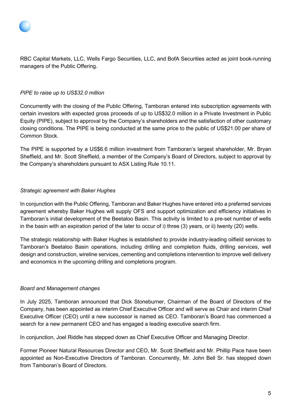 5 RBC Capital Markets, LLC, Wells Fargo Securities, LLC, and BofA Securities acted as joint book-running managers of the Public Offering. PIPE to raise up to US$32.0 million Concurrently with the closing of the Public Offering, Tamboran entered into subscription agreements with certain investors with expected gross proceeds of up to US$32.0 million in a Private Investment in Public Equity (PIPE), subject to approval by the Company’s shareholders and the satisfaction of other customary closing conditions. The PIPE is being conducted at the same price to the public of US$21.00 per share of Common Stock. The PIPE is supported by a US$6.6 million investment from Tamboran’s largest shareholder, Mr. Bryan Sheffield, and Mr. Scott Sheffield, a member of the Company’s Board of Directors, subject to approval by the Company’s shareholders pursuant to ASX Listing Rule 10.11. Strategic agreement with Baker Hughes In conjunction with the Public Offering, Tamboran and Baker Hughes have entered into a preferred services agreement whereby Baker Hughes will supply OFS and support optimization and efficiency initiatives in Tamboran’s initial development of the Beetaloo Basin. This activity is limited to a pre-set number of wells in the basin with an expiration period of the later to occur of i) three (3) years, or ii) twenty (20) wells. The strategic relationship with Baker Hughes is established to provide industry-leading oilfield services to Tamboran’s Beetaloo Basin operations, including drilling and completion fluids, drilling services, well design and construction, wireline services, cementing and completions intervention to improve well delivery and economics in the upcoming drilling and completions program. Board and Management changes In July 2025, Tamboran announced that Dick Stoneburner, Chairman of the Board of Directors of the Company, has been appointed as interim Chief Executive Officer and will serve as Chair and interim Chief Executive Officer (CEO) until a new successor is named as CEO. Tamboran’s Board has commenced a search for a new permanent CEO and has engaged a leading executive search firm. In conjunction, Joel Riddle has stepped down as Chief Executive Officer and Managing Director. Former Pioneer Natural Resources Director and CEO, Mr. Scott Sheffield and Mr. Phillip Pace have been appointed as Non-Executive Directors of Tamboran. Concurrently, Mr. John Bell Sr. has stepped down from Tamboran’s Board of Directors.