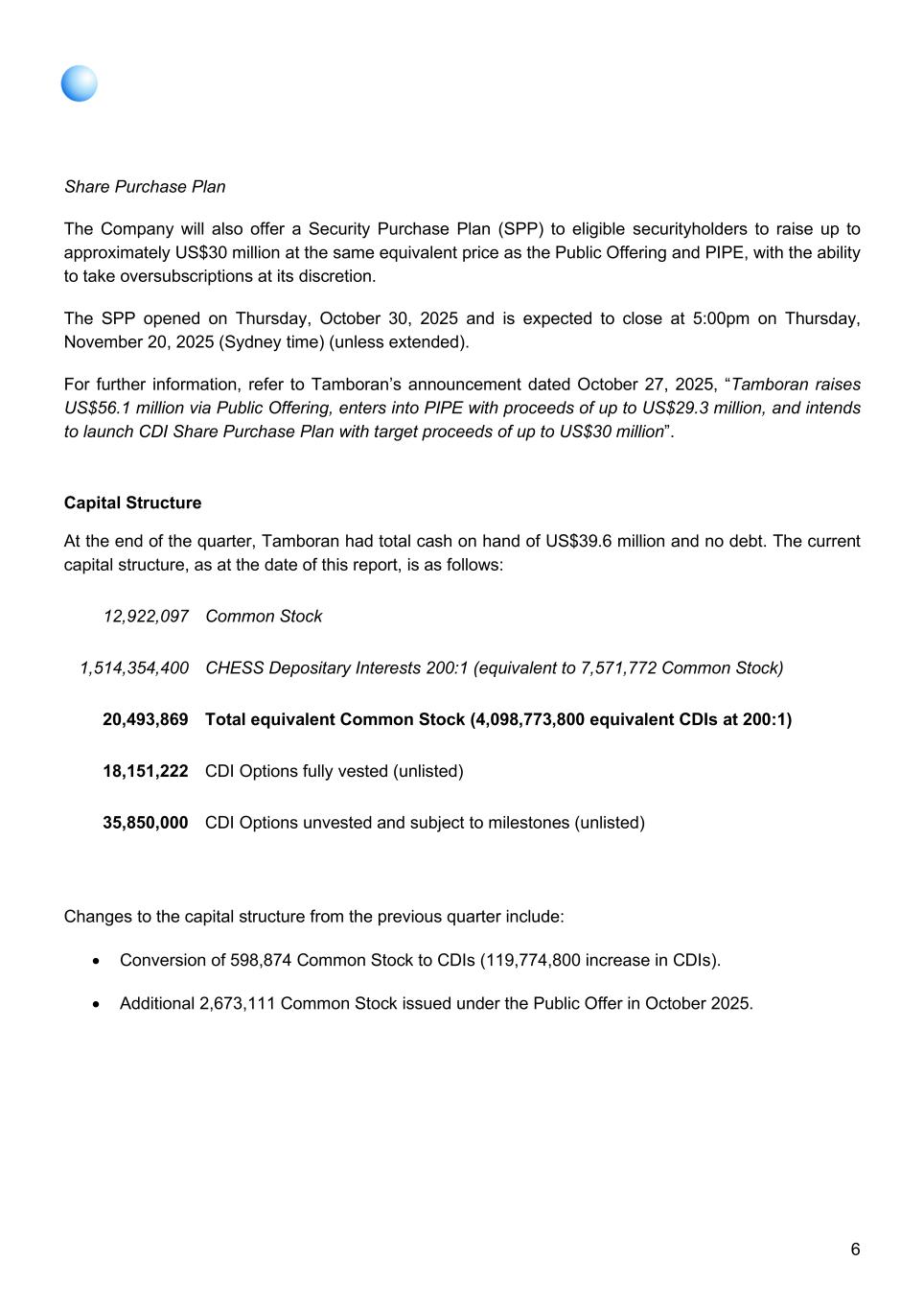 6 Share Purchase Plan The Company will also offer a Security Purchase Plan (SPP) to eligible securityholders to raise up to approximately US$30 million at the same equivalent price as the Public Offering and PIPE, with the ability to take oversubscriptions at its discretion. The SPP opened on Thursday, October 30, 2025 and is expected to close at 5:00pm on Thursday, November 20, 2025 (Sydney time) (unless extended). For further information, refer to Tamboran’s announcement dated October 27, 2025, “Tamboran raises US$56.1 million via Public Offering, enters into PIPE with proceeds of up to US$29.3 million, and intends to launch CDI Share Purchase Plan with target proceeds of up to US$30 million”. Capital Structure At the end of the quarter, Tamboran had total cash on hand of US$39.6 million and no debt. The current capital structure, as at the date of this report, is as follows: 12,922,097 Common Stock 1,514,354,400 CHESS Depositary Interests 200:1 (equivalent to 7,571,772 Common Stock) 20,493,869 Total equivalent Common Stock (4,098,773,800 equivalent CDIs at 200:1) 18,151,222 CDI Options fully vested (unlisted) 35,850,000 CDI Options unvested and subject to milestones (unlisted) Changes to the capital structure from the previous quarter include: • Conversion of 598,874 Common Stock to CDIs (119,774,800 increase in CDIs). • Additional 2,673,111 Common Stock issued under the Public Offer in October 2025.