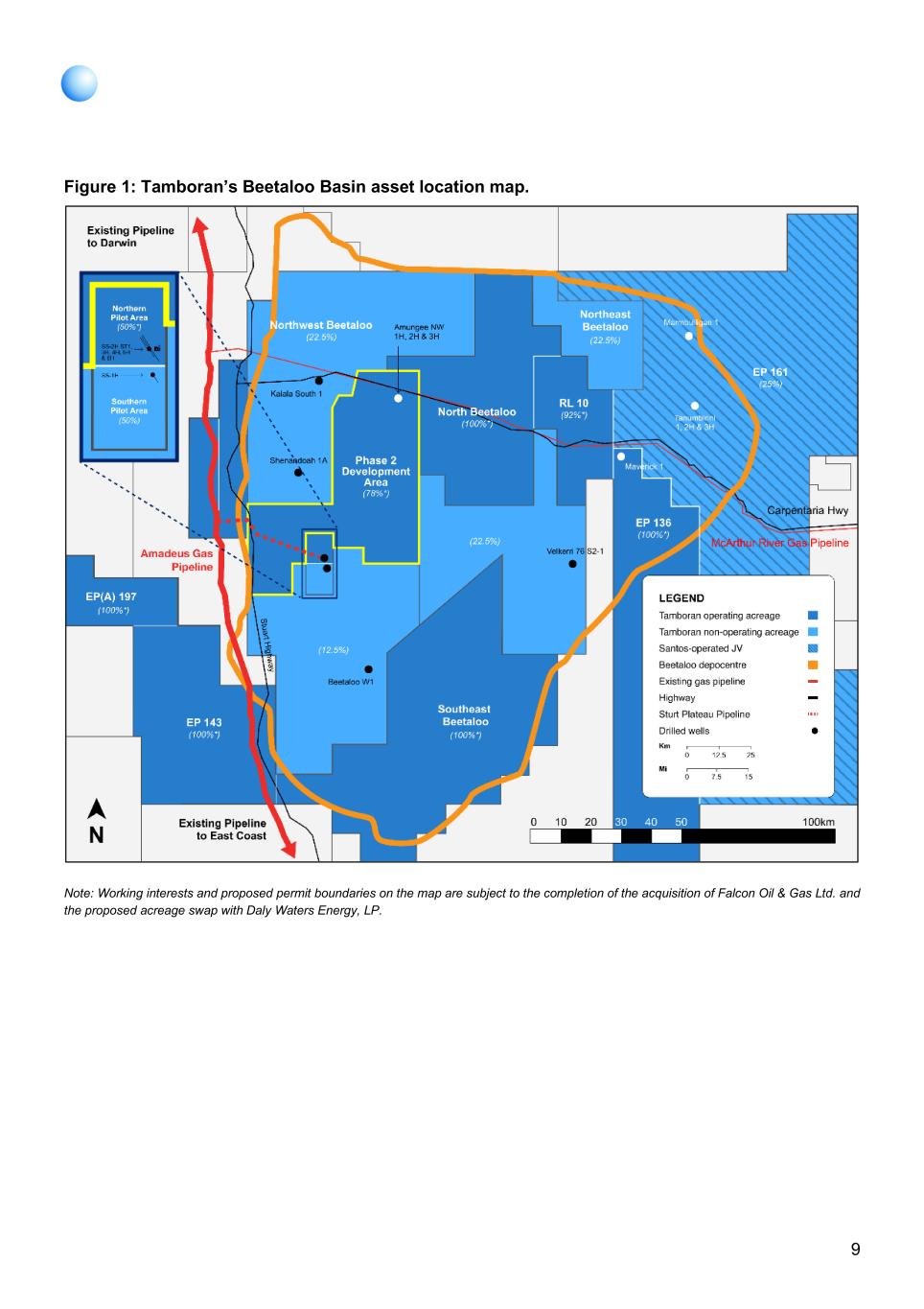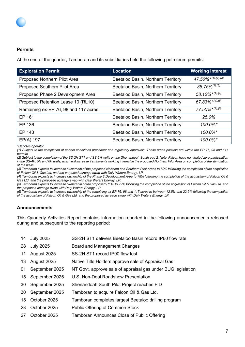 7 Permits At the end of the quarter, Tamboran and its subsidiaries held the following petroleum permits: Exploration Permit Location Working Interest Proposed Northern Pilot Area Beetaloo Basin, Northern Territory 47.50%*,(1),(2),(3) Proposed Southern Pilot Area Beetaloo Basin, Northern Territory 38.75%(1),(3) Proposed Phase 2 Development Area Beetaloo Basin, Northern Territory 58.12%*,(1),(4) Proposed Retention Lease 10 (RL10) Beetaloo Basin, Northern Territory 67.83%*,(1),(5) Remaining ex-EP 76, 98 and 117 acres Beetaloo Basin, Northern Territory 77.50%*,(1),(6) EP 161 Beetaloo Basin, Northern Territory 25.0% EP 136 Beetaloo Basin, Northern Territory 100.0%* EP 143 Beetaloo Basin, Northern Territory 100.0%* EP(A) 197 Beetaloo Basin, Northern Territory 100.0%* *Denotes operator. (1) Subject to the completion of certain conditions precedent and regulatory approvals. These areas position are within the EP 76, 98 and 117 permits (2) Subject to the completion of the SS-2H ST1 and SS-3H wells on the Shenandoah South pad 2. Note, Falcon have nominated zero participation in the SS-4H, 5H and 6H wells, which will increase Tamboran’s working interest in the proposed Northern Pilot Area on completion of the stimulation of the wells. (3) Tamboran expects to increase ownership of the proposed Northern and Southern Pilot Areas to 50% following the completion of the acquisition of Falcon Oil & Gas Ltd. and the proposed acreage swap with Daly Waters Energy, LP. (4) Tamboran expects to increase ownership of the Phase 2 Development Area to 78% following the completion of the acquisition of Falcon Oil & Gas Ltd. and the proposed acreage swap with Daly Waters Energy, LP. (5) Tamboran expects to increase ownership of the proposed RL10 to 92% following the completion of the acquisition of Falcon Oil & Gas Ltd. and the proposed acreage swap with Daly Waters Energy, LP. (6) Tamboran expects to increase ownership of the remaining ex-EP 76, 98 and 117 acres to between 12.5% and 22.5% following the completion of the acquisition of Falcon Oil & Gas Ltd. and the proposed acreage swap with Daly Waters Energy, LP. Announcements This Quarterly Activities Report contains information reported in the following announcements released during and subsequent to the reporting period: 14 July 2025 SS-2H ST1 delivers Beetaloo Basin record IP60 flow rate 28 July 2025 Board and Management Changes 11 August 2025 SS-2H ST1 record IP90 flow test 13 August 2025 Native Title Holders approve sale of Appraisal Gas 01 September 2025 NT Govt. approve sale of appraisal gas under BUG legislation 15 September 2025 U.S. Non-Deal Roadshow Presentation 30 September 2025 Shenandoah South Pilot Project reaches FID 30 September 2025 Tamboran to acquire Falcon Oil & Gas Ltd. 15 October 2025 Tamboran completes largest Beetaloo drilling program 23 October 2025 Public Offering of Common Stock 27 October 2025 Tamboran Announces Close of Public Offering