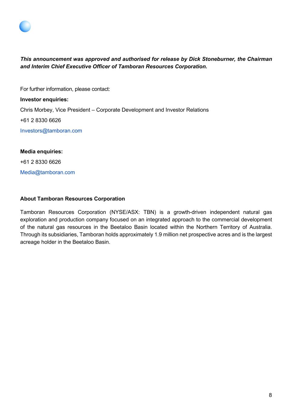 8 This announcement was approved and authorised for release by Dick Stoneburner, the Chairman and Interim Chief Executive Officer of Tamboran Resources Corporation. For further information, please contact: Investor enquiries: Chris Morbey, Vice President – Corporate Development and Investor Relations +61 2 8330 6626 Investors@tamboran.com Media enquiries: +61 2 8330 6626 Media@tamboran.com About Tamboran Resources Corporation Tamboran Resources Corporation (NYSE/ASX: TBN) is a growth-driven independent natural gas exploration and production company focused on an integrated approach to the commercial development of the natural gas resources in the Beetaloo Basin located within the Northern Territory of Australia. Through its subsidiaries, Tamboran holds approximately 1.9 million net prospective acres and is the largest acreage holder in the Beetaloo Basin.