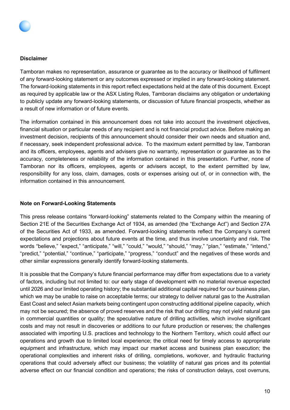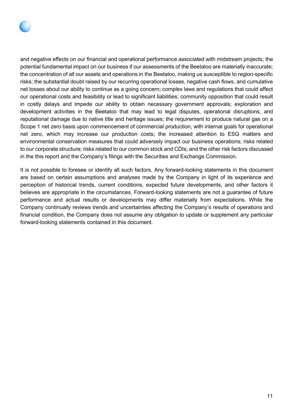 11 and negative effects on our financial and operational performance associated with midstream projects; the potential fundamental impact on our business if our assessments of the Beetaloo are materially inaccurate; the concentration of all our assets and operations in the Beetaloo, making us susceptible to region-specific risks; the substantial doubt raised by our recurring operational losses, negative cash flows, and cumulative net losses about our ability to continue as a going concern; complex laws and regulations that could affect our operational costs and feasibility or lead to significant liabilities; community opposition that could result in costly delays and impede our ability to obtain necessary government approvals; exploration and development activities in the Beetaloo that may lead to legal disputes, operational disruptions, and reputational damage due to native title and heritage issues; the requirement to produce natural gas on a Scope 1 net zero basis upon commencement of commercial production, with internal goals for operational net zero, which may increase our production costs; the increased attention to ESG matters and environmental conservation measures that could adversely impact our business operations; risks related to our corporate structure; risks related to our common stock and CDIs; and the other risk factors discussed in the this report and the Company’s filings with the Securities and Exchange Commission. It is not possible to foresee or identify all such factors. Any forward-looking statements in this document are based on certain assumptions and analyses made by the Company in light of its experience and perception of historical trends, current conditions, expected future developments, and other factors it believes are appropriate in the circumstances. Forward-looking statements are not a guarantee of future performance and actual results or developments may differ materially from expectations. While the Company continually reviews trends and uncertainties affecting the Company’s results of operations and financial condition, the Company does not assume any obligation to update or supplement any particular forward-looking statements contained in this document.