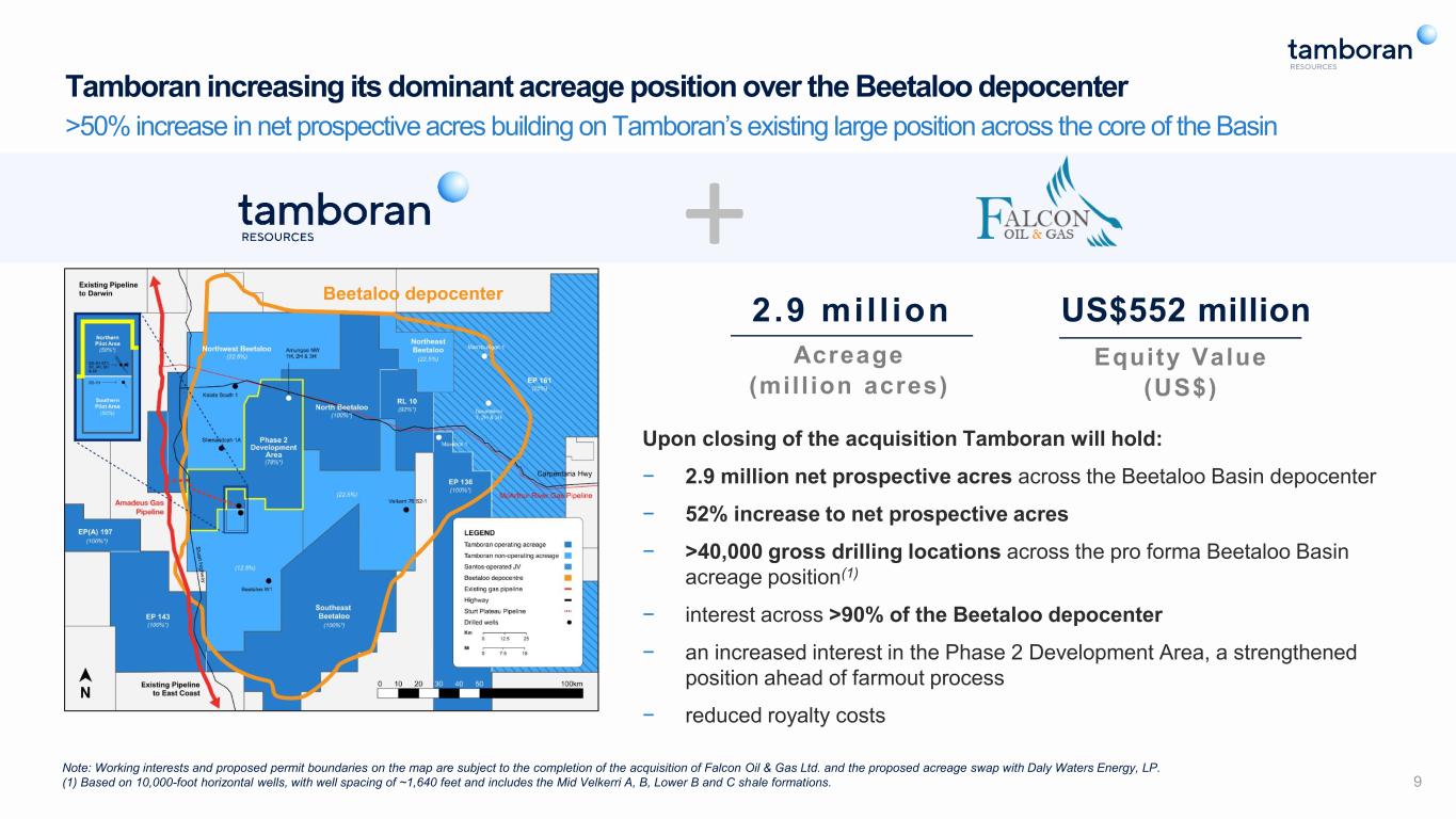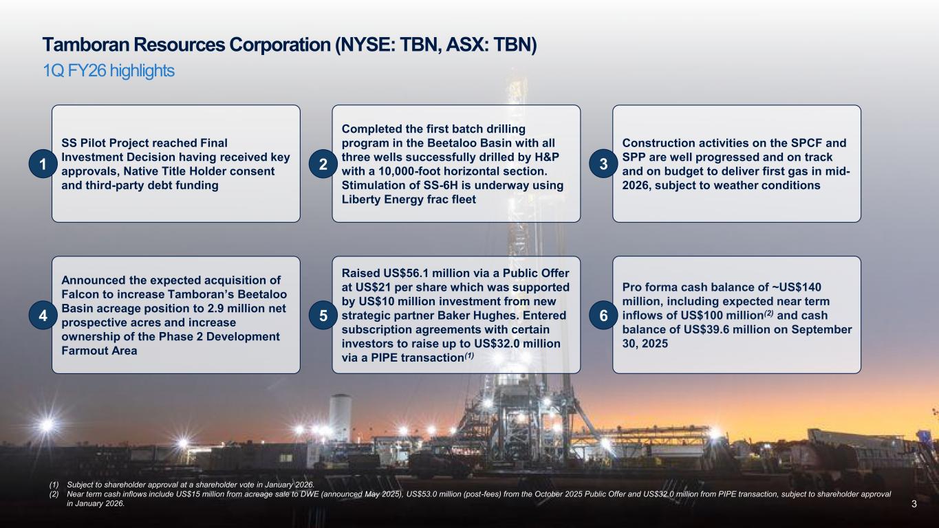 The information in this presentation includes “forward-looking statements” within the meaning of Section 27A of the Securities Act of 1933, as amended (the “Securities Act”), and Section 21E of the Securities Exchange Act of 1934, as amended (the “Exchange Act”), which include statements on Tamboran Resources Corporation's ("we", "us" or the "Company") opinions, expectations, beliefs, plans objectives, assumptions or projections regarding future events or future results. All statements, other than statements of historical fact included in this presentation regarding our strategy, present and future operations, financial position, estimated revenues and losses, projected costs, estimated reserves, prospects, plans and objectives of management are forward-looking statements. When used in this presentation, words such as “may,” “assume,” “forecast,” “could,” “should,” “will,” “plan,” “believe,” “anticipate,” “intend,” “estimate,” “expect,” “project,” “budget”, "achieve," "progress," "target," "expand," "deliver“, "potential," "propose," "enter," "provide," "contribute," and similar expressions are used to identify forward-looking statements, although not all forward-looking statements contain such identifying words. These forward-looking statements are based on management’s current belief, based on currently available information, as to the outcome and timing of future events at the time such statement was made. These forward‐looking statements are not a guarantee of our performance, and you should not place undue reliance on such statements. Forward looking statements may include statements about, among other things: our business strategy and the successful implementation of our business strategy; our future reserves; our financial strategy, liquidity and capital required for our development programs; estimated natural gas prices; our dividend policy; the timing and amount of future production of natural gas; our drilling and production plans; competition and government regulation; our ability to obtain and retain permits and governmental approvals; legal, regulatory or environmental matters; marketing of natural gas; business or leasehold acquisitions and integration of acquired businesses; our ability to develop our properties; the availability and cost of developing appropriate infrastructure around and transportation to our properties; the availability and cost of drilling rigs, production equipment, supplies, personnel and oilfield services; costs of developing our properties and of conducting our operations; our ability to reach FID and execute and complete our planned pipeline or planned LNG export projects; our anticipated Scope 1, Scope 2 and Scope 3 emissions from our businesses and our plans to offset our Scope 1, Scope 2 and Scope 3 emissions from our business; our ESG strategy and initiatives, including those relating to the generation and marketing of environmental attributes or new products seeking to benefit from ESG related activities; general economic conditions, including cost inflation; credit markets and the ability to obtain future financing on commercially acceptable terms; our ability to expand our business, including through the recruitment and retention of skilled personnel; our dependence on our key management personnel; our future operating results; and our plans, objectives, expectations and intentions. Except as otherwise required by applicable law, we disclaim any duty to update any forward-looking statements, all of which are expressly qualified by the statements in this section, to reflect events or circumstances after the date of this presentation. Tamboran is subject to known and unknown risks, many of which are beyond the ability of Tamboran to control or predict. These risks may include, for example, movements in oil and gas prices, risks associated with the development and operation of the acreage, exchange rate fluctuations, an inability to obtain funding on acceptable terms or at all, loss of key personnel, an inability to obtain appropriate licenses, permits and or/or other approvals, inaccuracies in resource estimates, share market risks and changes in general economic conditions. Such risks may affect actual and future results of Tamboran and its securities. Maps and diagrams contained in this presentation are provided to assist with the identification and description of Tamboran’s interests. The maps and diagrams may not be drawn to scale. This presentation includes market data and other statistical information from third party sources, including independent industry publications, government publications or other published independent sources. Although we believe these third-party sources are reliable as of their respective dates, we have not independently verified the accuracy or completeness of this information. The industry in which we operate is subject to a high degree of uncertainty and risk due to a variety of factors, which could cause our results to differ materially from those expressed in these third-party publications. Numbers in this report have been rounded. As a result, some figures may differ insignificantly due to rounding and totals reported may differ insignificantly from arithmetic addition of the rounded numbers. All currency amounts are represented as USD unless otherwise stated (AUD/USD exchange rate of 0.65). This presentation does not purport to be all inclusive or to necessarily contain all the information that you may need or desire to perform your analysis. In all cases, you should conduct your own investigation and analysis of the data set forth in this presentation, and should rely solely on your own judgment, review and analysis in evaluating this presentation. This presentation contains trademarks, tradenames and servicemarks of other companies that are the property of their respective owners. We do not intend our use or display of other co