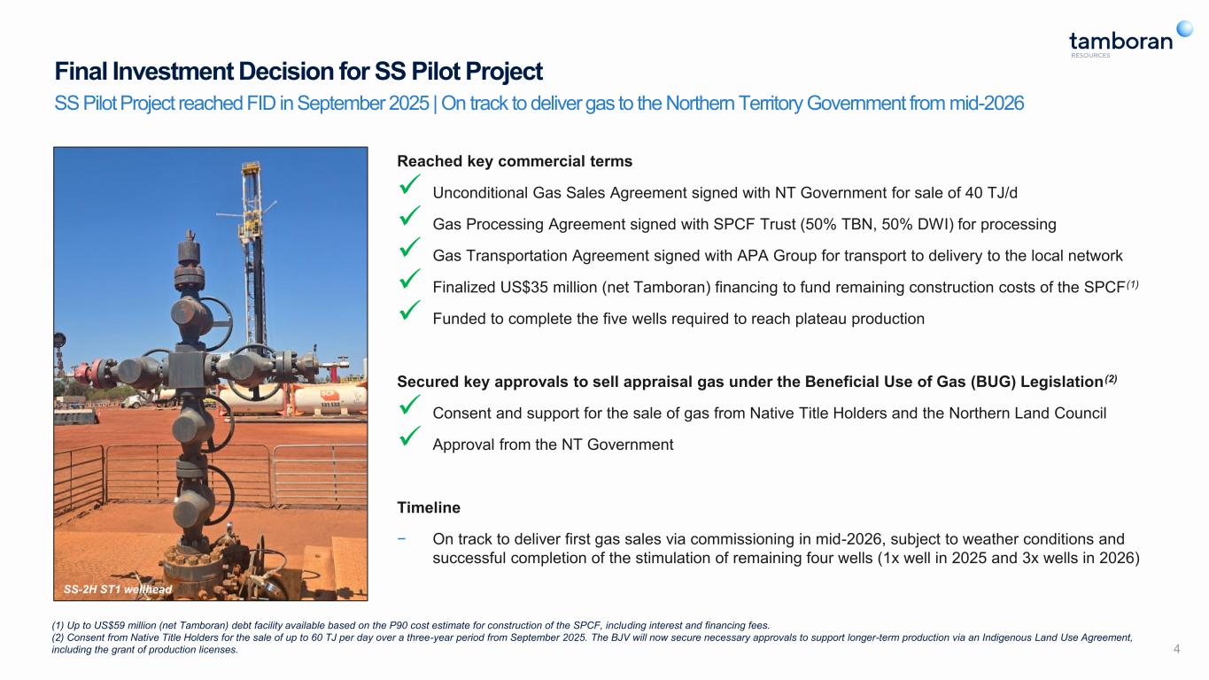 3 Tamboran Resources Corporation (NYSE: TBN, ASX: TBN) 1Q FY26 highlights SS Pilot Project reached Final Investment Decision having received key approvals, Native Title Holder consent and third-party debt funding Completed the first batch drilling program in the Beetaloo Basin with all three wells successfully drilled by H&P with a 10,000-foot horizontal section. Stimulation of SS-6H is underway using Liberty Energy frac fleet Announced the expected acquisition of Falcon to increase Tamboran’s Beetaloo Basin acreage position to 2.9 million net prospective acres and increase ownership of the Phase 2 Development Farmout Area Construction activities on the SPCF and SPP are well progressed and on track and on budget to deliver first gas in mid- 2026, subject to weather conditions Raised US$56.1 million via a Public Offer at US$21 per share which was supported by US$10 million investment from new strategic partner Baker Hughes. Entered subscription agreements with certain investors to raise up to US$32.0 million via a PIPE transaction(1) Pro forma cash balance of ~US$140 million, including expected near term inflows of US$100 million(2) and cash balance of US$39.6 million on September 30, 2025 1 2 4 3 5 6 (1) Subject to shareholder approval at a shareholder vote in January 2026. (2) Near term cash inflows include US$15 million from acreage sale to DWE (announced May 2025), US$53.0 million (post-fees) from the October 2025 Public Offer and US$32.0 million from PIPE transaction, subject to shareholder approval in January 2026.