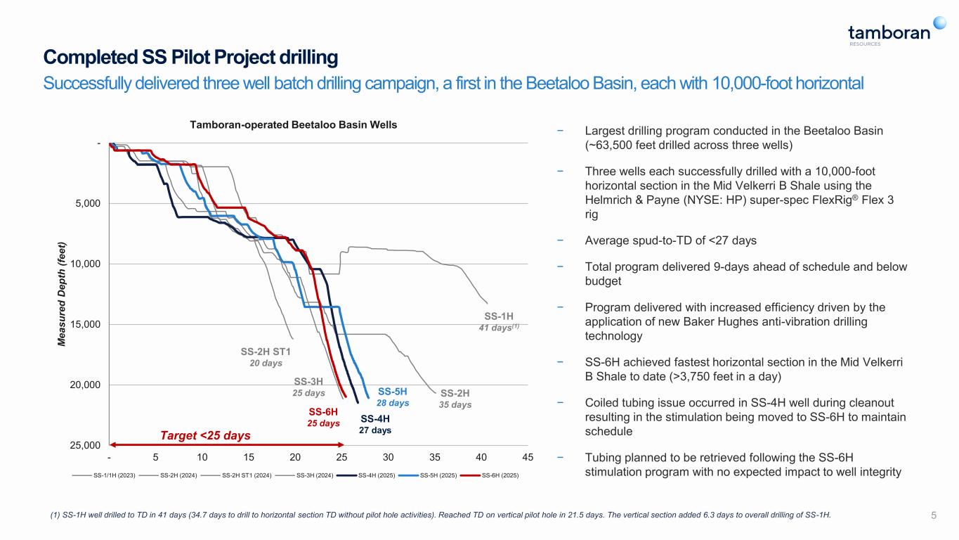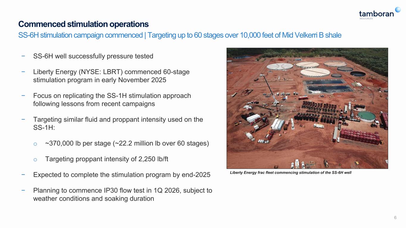 5 Completed SS Pilot Project drilling Successfully delivered three well batch drilling campaign, a first in the Beetaloo Basin, each with 10,000-foot horizontal - 5,000 10,000 15,000 20,000 25,000 - 5 10 15 20 25 30 35 40 45 M e a s u re d D e p th ( fe e t) Tamboran-operated Beetaloo Basin Wells SS-1/1H (2023) SS-2H (2024) SS-2H ST1 (2024) SS-3H (2024) SS-4H (2025) SS-5H (2025) SS-6H (2025) SS-2H ST1 20 days − Largest drilling program conducted in the Beetaloo Basin (~63,500 feet drilled across three wells) − Three wells each successfully drilled with a 10,000-foot horizontal section in the Mid Velkerri B Shale using the Helmrich & Payne (NYSE: HP) super-spec FlexRig® Flex 3 rig − Average spud-to-TD of <27 days − Total program delivered 9-days ahead of schedule and below budget − Program delivered with increased efficiency driven by the application of new Baker Hughes anti-vibration drilling technology − SS-6H achieved fastest horizontal section in the Mid Velkerri B Shale to date (>3,750 feet in a day) − Coiled tubing issue occurred in SS-4H well during cleanout resulting in the stimulation being moved to SS-6H to maintain schedule − Tubing planned to be retrieved following the SS-6H stimulation program with no expected impact to well integrity Target <25 days (1) SS-1H well drilled to TD in 41 days (34.7 days to drill to horizontal section TD without pilot hole activities). Reached TD on vertical pilot hole in 21.5 days. The vertical section added 6.3 days to overall drilling of SS-1H. SS-3H 25 days SS-2H 35 days SS-1H 41 days(1) SS-5H 28 days SS-4H 27 days SS-6H 25 days