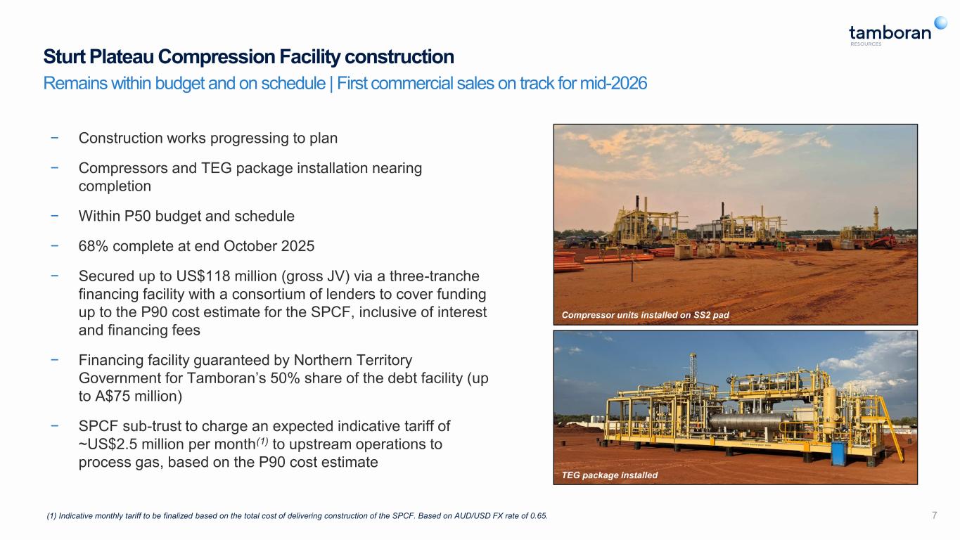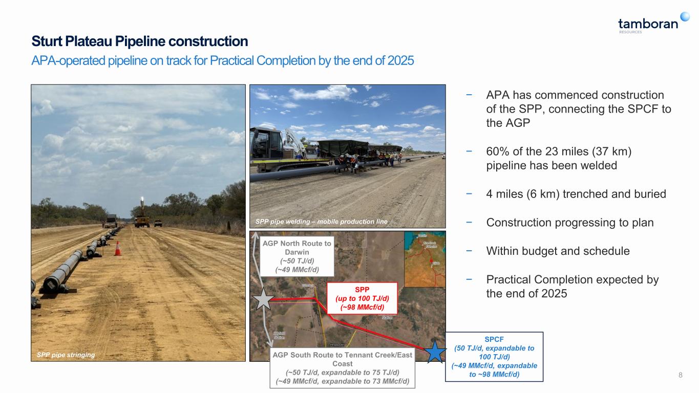 Sturt Plateau Compression Facility construction Remains within budget and on schedule | First commercial sales on track for mid-2026 7 Compressor units installed on SS2 pad TEG package installed − Construction works progressing to plan − Compressors and TEG package installation nearing completion − Within P50 budget and schedule − 68% complete at end October 2025 − Secured up to US$118 million (gross JV) via a three-tranche financing facility with a consortium of lenders to cover funding up to the P90 cost estimate for the SPCF, inclusive of interest and financing fees − Financing facility guaranteed by Northern Territory Government for Tamboran’s 50% share of the debt facility (up to A$75 million) − SPCF sub-trust to charge an expected indicative tariff of ~US$2.5 million per month(1) to upstream operations to process gas, based on the P90 cost estimate (1) Indicative monthly tariff to be finalized based on the total cost of delivering construction of the SPCF. Based on AUD/USD FX rate of 0.65.