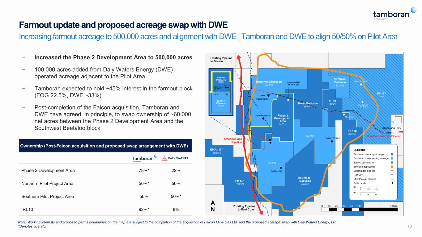 US$552 million Equity Value (US$) 9 Tamboran increasing its dominant acreage position over the Beetaloo depocenter >50% increase in net prospective acres building on Tamboran’s existing large position across the core of the Basin Upon closing of the acquisition Tamboran will hold: − 2.9 million net prospective acres across the Beetaloo Basin depocenter − 52% increase to net prospective acres − >40,000 gross drilling locations across the pro forma Beetaloo Basin acreage position(1) − interest across >90% of the Beetaloo depocenter − an increased interest in the Phase 2 Development Area, a strengthened position ahead of farmout process − reduced royalty costs Note: Working interests and proposed permit boundaries on the map are subject to the completion of the acquisition of Falcon Oil & Gas Ltd. and the proposed acreage swap with Daly Waters Energy, LP. (1) Based on 10,000-foot horizontal wells, with well spacing of ~1,640 feet and includes the Mid Velkerri A, B, Lower B and C shale formations. Beetaloo depocenter 2.9 mil l ion Acreage (mil l ion acres) +