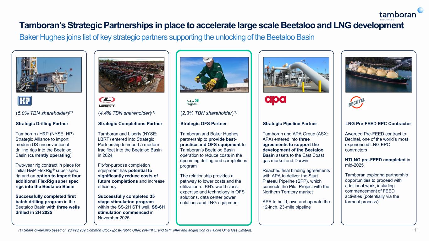 Tamboran’s Strategic Partnerships in place to accelerate large scale Beetaloo and LNG development Baker Hughes joins list of key strategic partners supporting the unlocking of the Beetaloo Basin 11 (5.0% TBN shareholder)(1) Strategic Drilling Partner Tamboran / H&P (NYSE: HP) Strategic Alliance to import modern US unconventional drilling rigs into the Beetaloo Basin (currently operating) Two-year rig contract in place for initial H&P FlexRig® super-spec rig and an option to import four additional FlexRig super spec rigs into the Beetaloo Basin Successfully completed first batch drilling program in the Beetaloo Basin with three wells drilled in 2H 2025 (4.4% TBN shareholder)(1) Strategic Completions Partner Tamboran and Liberty (NYSE: LBRT) entered into Strategic Partnership to import a modern frac fleet into the Beetaloo Basin in 2024 Fit-for-purpose completion equipment has potential to significantly reduce costs of future completions and increase efficiency Successfully completed 35 stage stimulation program within the SS-2H ST1 well. SS-6H stimulation commenced in November 2025 Strategic Pipeline Partner Tamboran and APA Group (ASX: APA) entered into three agreements to support the development of the Beetaloo Basin assets to the East Coast gas market and Darwin Reached final binding agreements with APA to deliver the Sturt Plateau Pipeline (SPP), which connects the Pilot Project with the Northern Territory market APA to build, own and operate the 12-inch, 23-mile pipeline LNG Pre-FEED EPC Contractor Awarded Pre-FEED contract to Bechtel, one of the world’s most experienced LNG EPC contractors NTLNG pre-FEED completed in mid-2025 Tamboran exploring partnership opportunities to proceed with additional work, including commencement of FEED activities (potentially via the farmout process) (2.3% TBN shareholder)(1) Strategic OFS Partner Tamboran and Baker Hughes partnership to provide best- practice and OFS equipment to Tamboran’s Beetaloo Basin operation to reduce costs in the upcoming drilling and completions program The relationship provides a pathway to lower costs and the utilization of BH’s world class expertise and technology in OFS solutions, data center power solutions and LNG equipment (1) Share ownership based on 20,493,969 Common Stock (post-Public Offer, pre-PIPE and SPP offer and acquisition of Falcon Oil & Gas Limited).