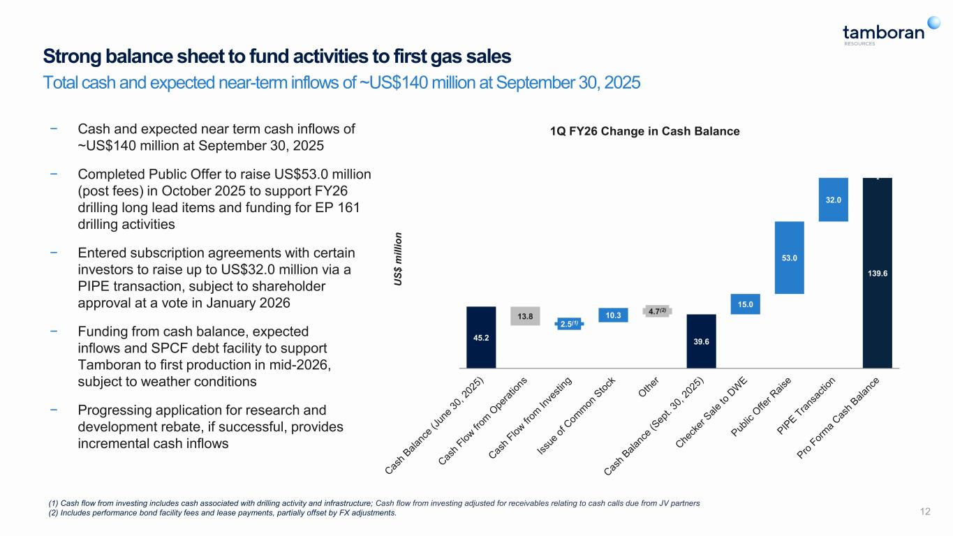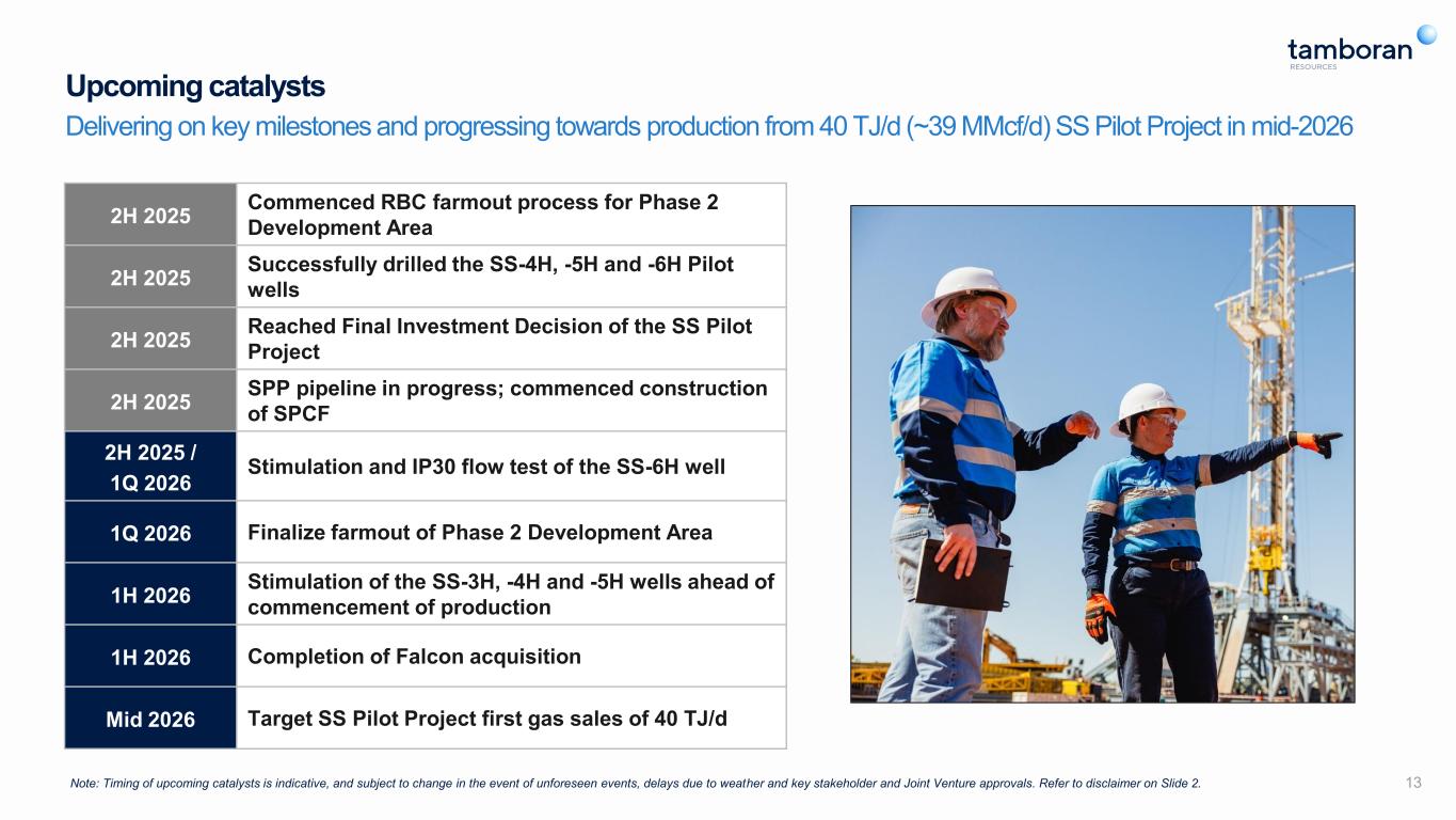 Strong balance sheet to fund activities to first gas sales 12 (1) Cash flow from investing includes cash associated with drilling activity and infrastructure; Cash flow from investing adjusted for receivables relating to cash calls due from JV partners (2) Includes performance bond facility fees and lease payments, partially offset by FX adjustments. Total cash and expected near-term inflows of ~US$140 million at September 30, 2025 − Cash and expected near term cash inflows of ~US$140 million at September 30, 2025 − Completed Public Offer to raise US$53.0 million (post fees) in October 2025 to support FY26 drilling long lead items and funding for EP 161 drilling activities − Entered subscription agreements with certain investors to raise up to US$32.0 million via a PIPE transaction, subject to shareholder approval at a vote in January 2026 − Funding from cash balance, expected inflows and SPCF debt facility to support Tamboran to first production in mid-2026, subject to weather conditions − Progressing application for research and development rebate, if successful, provides incremental cash inflows 39.6 139.6 13.8 4.7(2) 45.2 2.5(1) 10.3 15.0 53.0 32.0 - U S $ m il li o n 1Q FY26 Change in Cash Balance