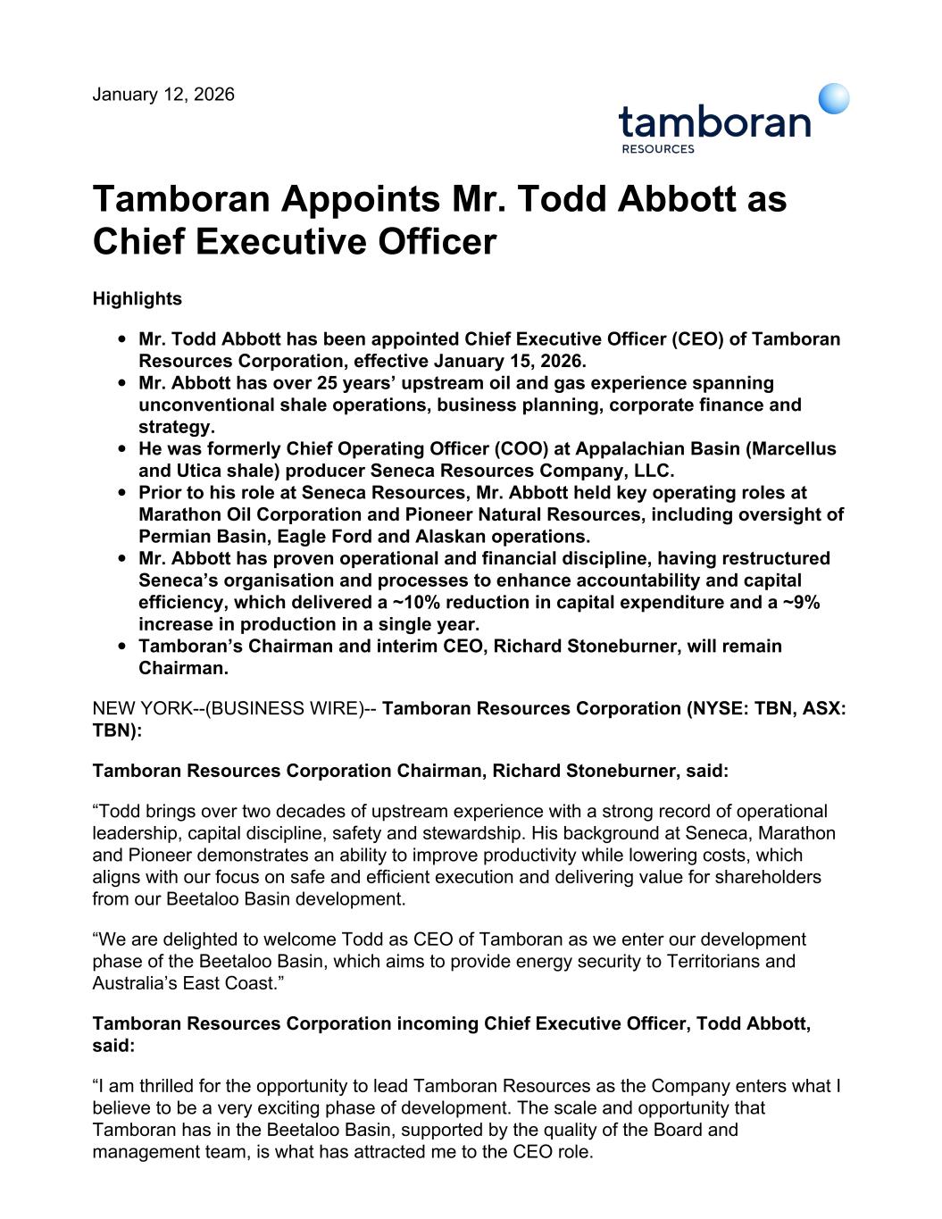 January 12, 2026 Tamboran Appoints Mr. Todd Abbott as Chief Executive Officer Highlights Mr. Todd Abbott has been appointed Chief Executive Officer (CEO) of Tamboran Resources Corporation, effective January 15, 2026. Mr. Abbott has over 25 years’ upstream oil and gas experience spanning unconventional shale operations, business planning, corporate finance and strategy. He was formerly Chief Operating Officer (COO) at Appalachian Basin (Marcellus and Utica shale) producer Seneca Resources Company, LLC. Prior to his role at Seneca Resources, Mr. Abbott held key operating roles at Marathon Oil Corporation and Pioneer Natural Resources, including oversight of Permian Basin, Eagle Ford and Alaskan operations. Mr. Abbott has proven operational and financial discipline, having restructured Seneca’s organisation and processes to enhance accountability and capital efficiency, which delivered a ~10% reduction in capital expenditure and a ~9% increase in production in a single year. Tamboran’s Chairman and interim CEO, Richard Stoneburner, will remain Chairman. NEW YORK--(BUSINESS WIRE)-- Tamboran Resources Corporation (NYSE: TBN, ASX: TBN): Tamboran Resources Corporation Chairman, Richard Stoneburner, said: “Todd brings over two decades of upstream experience with a strong record of operational leadership, capital discipline, safety and stewardship. His background at Seneca, Marathon and Pioneer demonstrates an ability to improve productivity while lowering costs, which aligns with our focus on safe and efficient execution and delivering value for shareholders from our Beetaloo Basin development. “We are delighted to welcome Todd as CEO of Tamboran as we enter our development phase of the Beetaloo Basin, which aims to provide energy security to Territorians and Australia’s East Coast.” Tamboran Resources Corporation incoming Chief Executive Officer, Todd Abbott, said: “I am thrilled for the opportunity to lead Tamboran Resources as the Company enters what I believe to be a very exciting phase of development. The scale and opportunity that Tamboran has in the Beetaloo Basin, supported by the quality of the Board and management team, is what has attracted me to the CEO role.