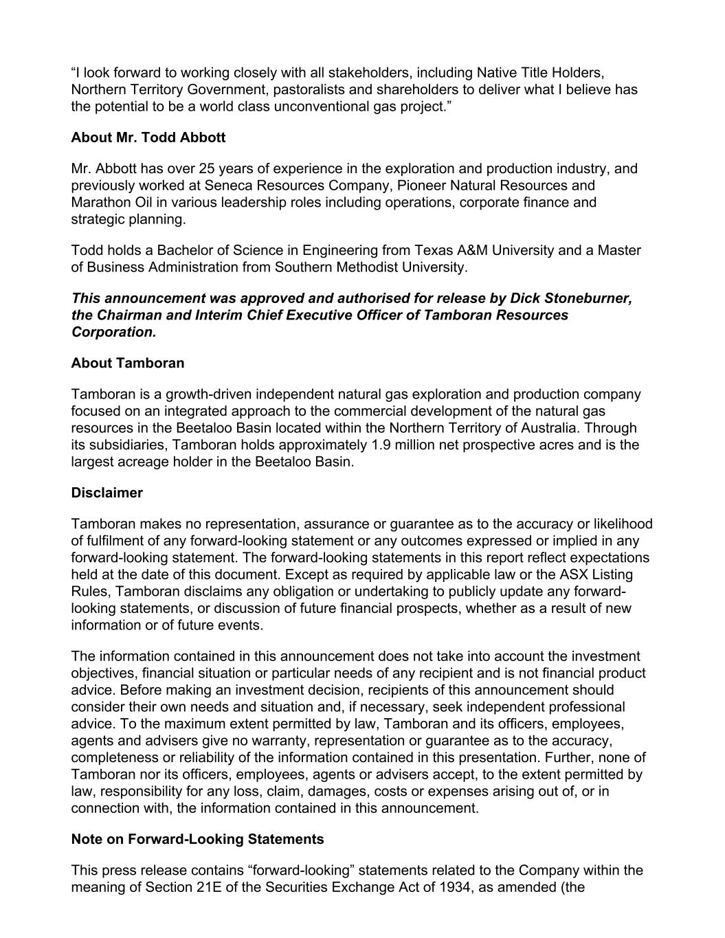 “I look forward to working closely with all stakeholders, including Native Title Holders, Northern Territory Government, pastoralists and shareholders to deliver what I believe has the potential to be a world class unconventional gas project.” About Mr. Todd Abbott Mr. Abbott has over 25 years of experience in the exploration and production industry, and previously worked at Seneca Resources Company, Pioneer Natural Resources and Marathon Oil in various leadership roles including operations, corporate finance and strategic planning. Todd holds a Bachelor of Science in Engineering from Texas A&M University and a Master of Business Administration from Southern Methodist University. This announcement was approved and authorised for release by Dick Stoneburner, the Chairman and Interim Chief Executive Officer of Tamboran Resources Corporation. About Tamboran Tamboran is a growth-driven independent natural gas exploration and production company focused on an integrated approach to the commercial development of the natural gas resources in the Beetaloo Basin located within the Northern Territory of Australia. Through its subsidiaries, Tamboran holds approximately 1.9 million net prospective acres and is the largest acreage holder in the Beetaloo Basin. Disclaimer Tamboran makes no representation, assurance or guarantee as to the accuracy or likelihood of fulfilment of any forward-looking statement or any outcomes expressed or implied in any forward-looking statement. The forward-looking statements in this report reflect expectations held at the date of this document. Except as required by applicable law or the ASX Listing Rules, Tamboran disclaims any obligation or undertaking to publicly update any forward- looking statements, or discussion of future financial prospects, whether as a result of new information or of future events. The information contained in this announcement does not take into account the investment objectives, financial situation or particular needs of any recipient and is not financial product advice. Before making an investment decision, recipients of this announcement should consider their own needs and situation and, if necessary, seek independent professional advice. To the maximum extent permitted by law, Tamboran and its officers, employees, agents and advisers give no warranty, representation or guarantee as to the accuracy, completeness or reliability of the information contained in this presentation. Further, none of Tamboran nor its officers, employees, agents or advisers accept, to the extent permitted by law, responsibility for any loss, claim, damages, costs or expenses arising out of, or in connection with, the information contained in this announcement. Note on Forward-Looking Statements This press release contains “forward-looking” statements related to the Company within the meaning of Section 21E of the Securities Exchange Act of 1934, as amended (the