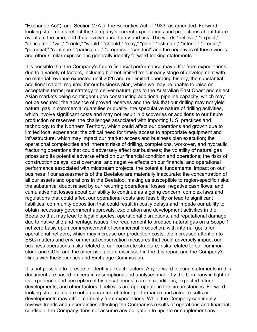 “Exchange Act”), and Section 27A of the Securities Act of 1933, as amended. Forward- looking statements reflect the Company’s current expectations and projections about future events at the time, and thus involve uncertainty and risk. The words “believe,” “expect,” “anticipate,” “will,” “could,” “would,” “should,” “may,” “plan,” “estimate,” “intend,” “predict,” “potential,” “continue,” “participate,” “progress,” “conduct” and the negatives of these words and other similar expressions generally identify forward-looking statements. It is possible that the Company’s future financial performance may differ from expectations due to a variety of factors, including but not limited to: our early stage of development with no material revenue expected until 2026 and our limited operating history; the substantial additional capital required for our business plan, which we may be unable to raise on acceptable terms; our strategy to deliver natural gas to the Australian East Coast and select Asian markets being contingent upon constructing additional pipeline capacity, which may not be secured; the absence of proved reserves and the risk that our drilling may not yield natural gas in commercial quantities or quality; the speculative nature of drilling activities, which involve significant costs and may not result in discoveries or additions to our future production or reserves; the challenges associated with importing U.S. practices and technology to the Northern Territory, which could affect our operations and growth due to limited local experience; the critical need for timely access to appropriate equipment and infrastructure, which may impact our market access and business plan execution; the operational complexities and inherent risks of drilling, completions, workover, and hydraulic fracturing operations that could adversely affect our business; the volatility of natural gas prices and its potential adverse effect on our financial condition and operations; the risks of construction delays, cost overruns, and negative effects on our financial and operational performance associated with midstream projects; the potential fundamental impact on our business if our assessments of the Beetaloo are materially inaccurate; the concentration of all our assets and operations in the Beetaloo, making us susceptible to region-specific risks; the substantial doubt raised by our recurring operational losses, negative cash flows, and cumulative net losses about our ability to continue as a going concern; complex laws and regulations that could affect our operational costs and feasibility or lead to significant liabilities; community opposition that could result in costly delays and impede our ability to obtain necessary government approvals; exploration and development activities in the Beetaloo that may lead to legal disputes, operational disruptions, and reputational damage due to native title and heritage issues; the requirement to produce natural gas on a Scope 1 net zero basis upon commencement of commercial production, with internal goals for operational net zero, which may increase our production costs; the increased attention to ESG matters and environmental conservation measures that could adversely impact our business operations; risks related to our corporate structure; risks related to our common stock and CDIs; and the other risk factors discussed in the this report and the Company’s filings with the Securities and Exchange Commission. It is not possible to foresee or identify all such factors. Any forward-looking statements in this document are based on certain assumptions and analyses made by the Company in light of its experience and perception of historical trends, current conditions, expected future developments, and other factors it believes are appropriate in the circumstances. Forward- looking statements are not a guarantee of future performance and actual results or developments may differ materially from expectations. While the Company continually reviews trends and uncertainties affecting the Company’s results of operations and financial condition, the Company does not assume any obligation to update or supplement any