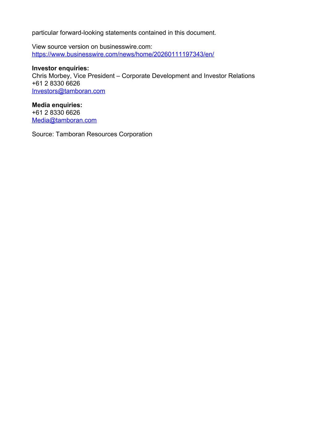 particular forward-looking statements contained in this document. View source version on businesswire.com: https://www.businesswire.com/news/home/20260111197343/en/ Investor enquiries: Chris Morbey, Vice President – Corporate Development and Investor Relations +61 2 8330 6626 Investors@tamboran.com Media enquiries: +61 2 8330 6626 Media@tamboran.com Source: Tamboran Resources Corporation