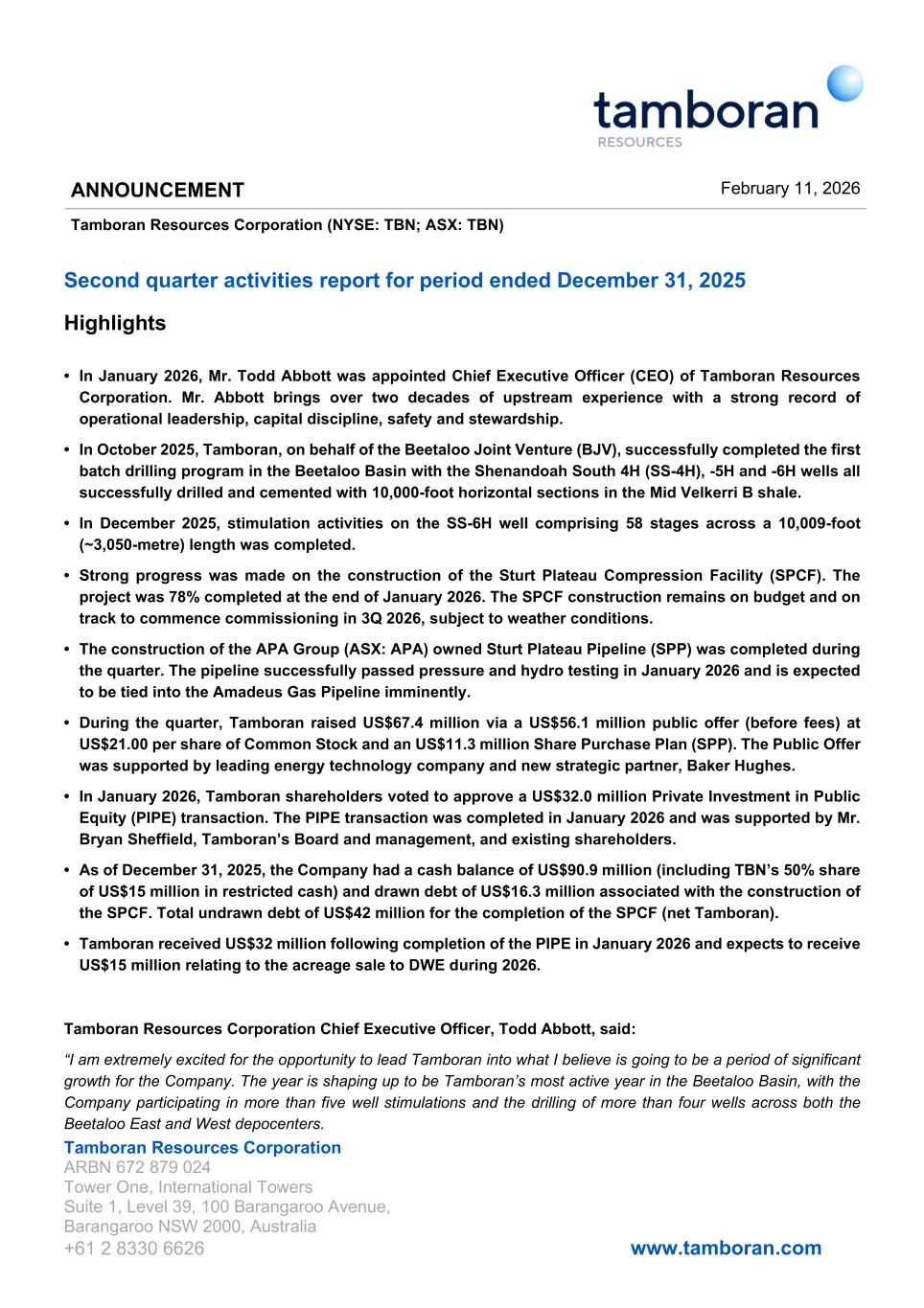 Tamboran Resources Corporation ARBN 672 879 024 Tower One, International Towers Suite 1, Level 39, 100 Barangaroo Avenue, Barangaroo NSW 2000, Australia +61 2 8330 6626 www.tamboran.com Second quarter activities report for period ended December 31, 2025 Highlights • In January 2026, Mr. Todd Abbott was appointed Chief Executive Officer (CEO) of Tamboran Resources Corporation. Mr. Abbott brings over two decades of upstream experience with a strong record of operational leadership, capital discipline, safety and stewardship. • In October 2025, Tamboran, on behalf of the Beetaloo Joint Venture (BJV), successfully completed the first batch drilling program in the Beetaloo Basin with the Shenandoah South 4H (SS-4H), -5H and -6H wells all successfully drilled and cemented with 10,000-foot horizontal sections in the Mid Velkerri B shale. • In December 2025, stimulation activities on the SS-6H well comprising 58 stages across a 10,009-foot (~3,050-metre) length was completed. • Strong progress was made on the construction of the Sturt Plateau Compression Facility (SPCF). The project was 78% completed at the end of January 2026. The SPCF construction remains on budget and on track to commence commissioning in 3Q 2026, subject to weather conditions. • The construction of the APA Group (ASX: APA) owned Sturt Plateau Pipeline (SPP) was completed during the quarter. The pipeline successfully passed pressure and hydro testing in January 2026 and is expected to be tied into the Amadeus Gas Pipeline imminently. • During the quarter, Tamboran raised US$67.4 million via a US$56.1 million public offer (before fees) at US$21.00 per share of Common Stock and an US$11.3 million Share Purchase Plan (SPP). The Public Offer was supported by leading energy technology company and new strategic partner, Baker Hughes. • In January 2026, Tamboran shareholders voted to approve a US$32.0 million Private Investment in Public Equity (PIPE) transaction. The PIPE transaction was completed in January 2026 and was supported by Mr. Bryan Sheffield, Tamboran’s Board and management, and existing shareholders. • As of December 31, 2025, the Company had a cash balance of US$90.9 million (including TBN’s 50% share of US$15 million in restricted cash) and drawn debt of US$16.3 million associated with the construction of the SPCF. Total undrawn debt of US$42 million for the completion of the SPCF (net Tamboran). • Tamboran received US$32 million following completion of the PIPE in January 2026 and expects to receive US$15 million relating to the acreage sale to DWE during 2026. Tamboran Resources Corporation Chief Executive Officer, Todd Abbott, said: “I am extremely excited for the opportunity to lead Tamboran into what I believe is going to be a period of significant growth for the Company. The year is shaping up to be Tamboran’s most active year in the Beetaloo Basin, with the Company participating in more than five well stimulations and the drilling of more than four wells across both the Beetaloo East and West depocenters. ANNOUNCEMENT February 11, 2026 Tamboran Resources Corporation (NYSE: TBN; ASX: TBN)